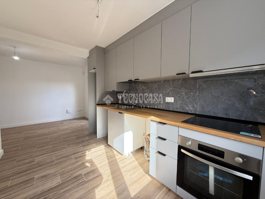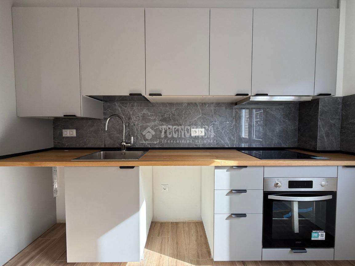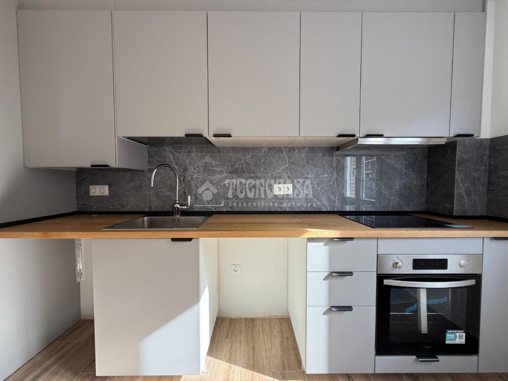 Estupenda vivienda que cuenta con salón y cocina americana con encimera de madera maciza y alicatado que da juego con el color del mobiliario, espacios para lavavajillas, nevera y lavadora. (Mobiliario de IKEA diseñado a medida), se entrega con horno, vitroceramica y campana extractora.